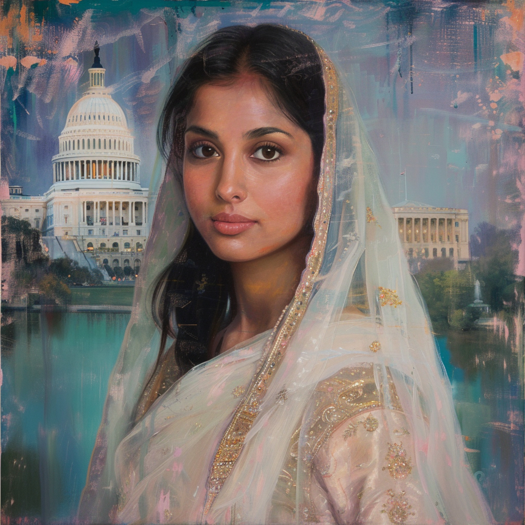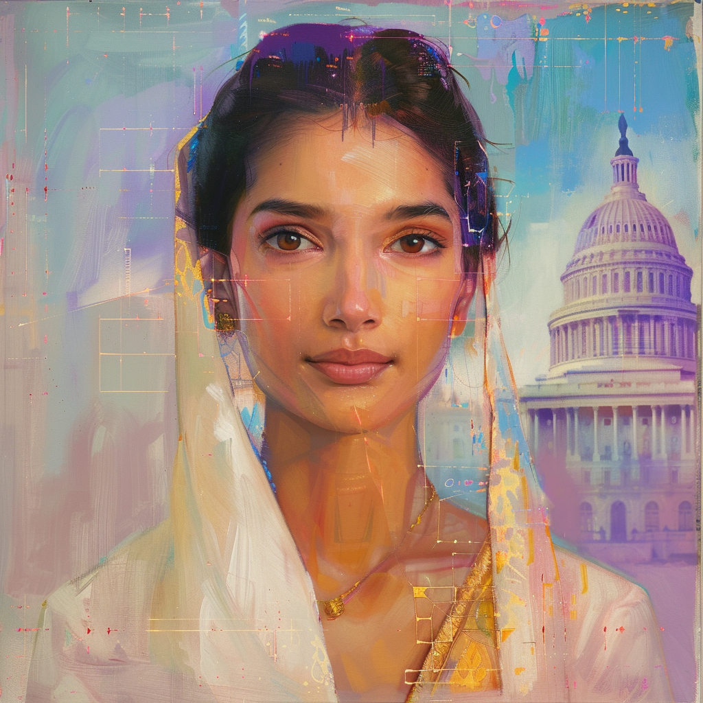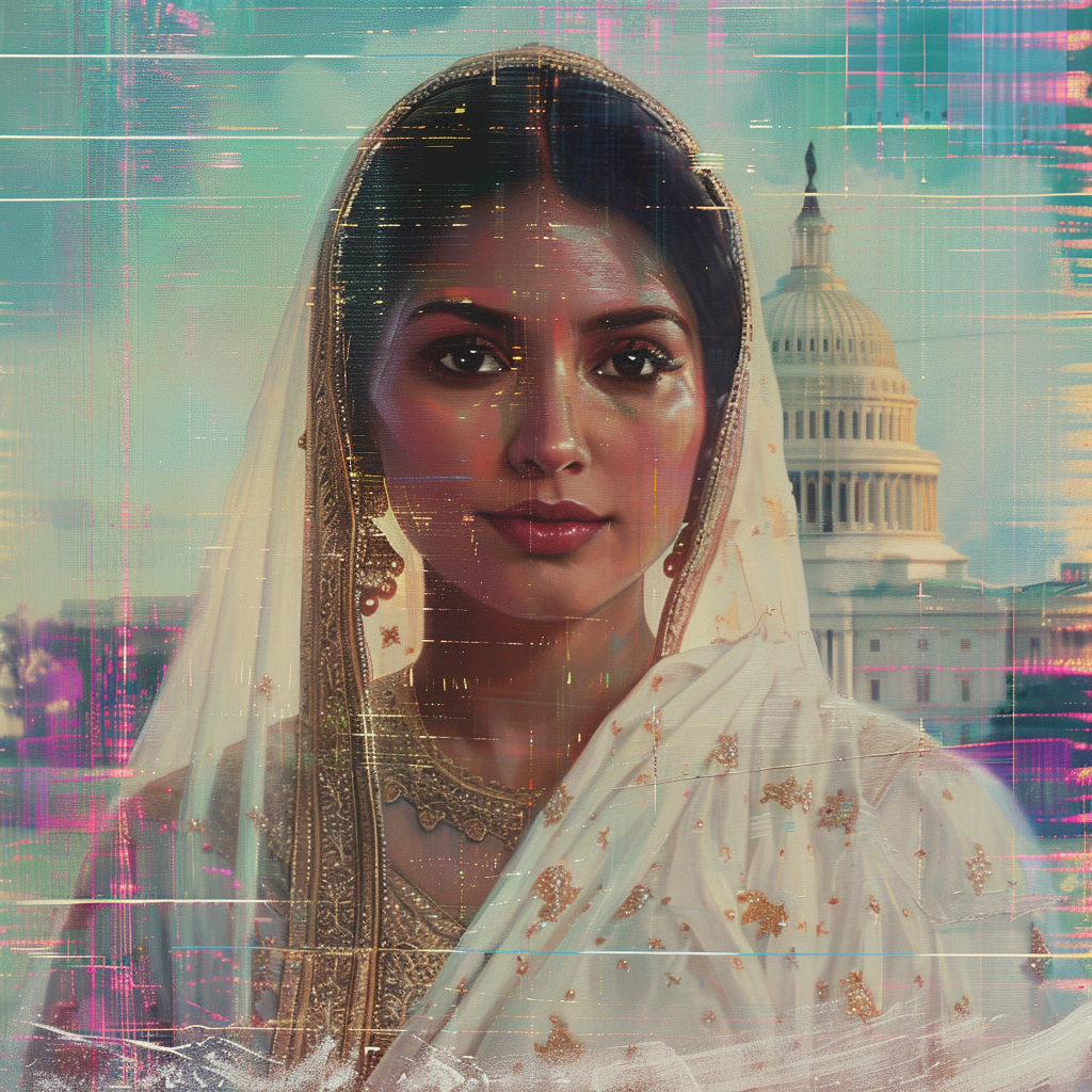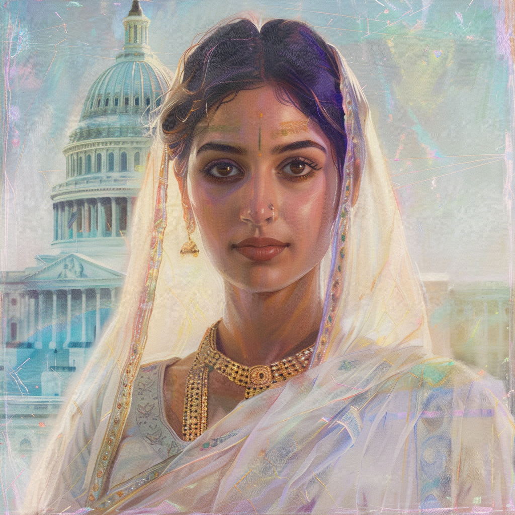 A classic oil painting portrait of a young, South Asian woman with determined eyes, adorned with a flowing white dupatta. Her clothing is a blend of a powerful business suit and traditional Indian wear. In the background, a faint outline of the US Capitol building shimmers through a wall of glitching VHS static. The overall mood is dreamlike and nostalgic, with a color palette of pale pinks, blues, and purples. Vaporwave style.
