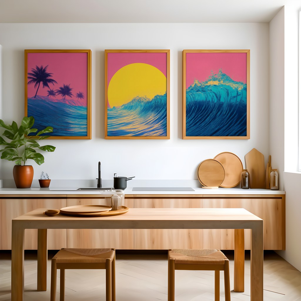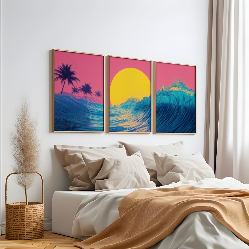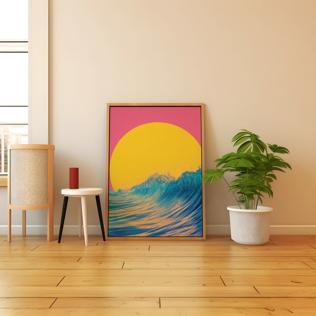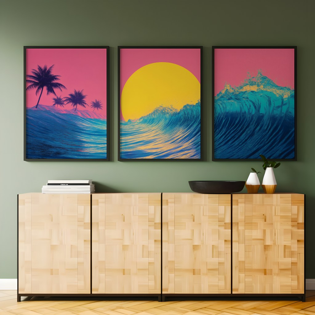 Ready to add a splash of retro paradise to your digital life? Head over to our Etsy shop now and grab your Vaporwave Sunset Wave wall art.