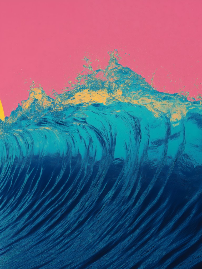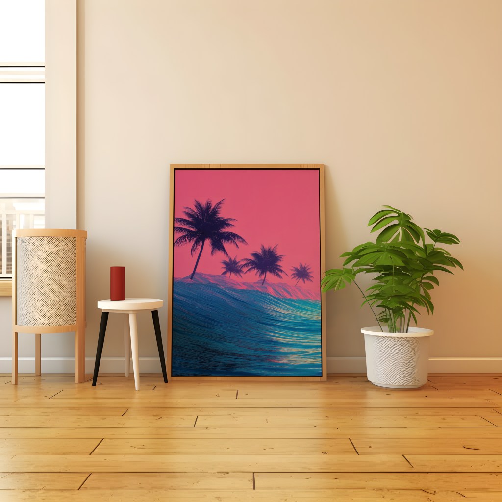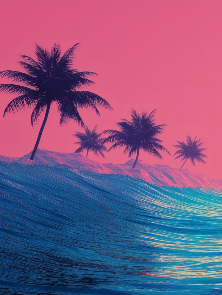 This piece isn’t just an image; it’s a mood, a feeling, a trip back to the sun-drenched, neon-lit dreams of the 80s, reimagined for today’s digital age. Imagine a colossal, golden sun dominating a striking hot pink sky, its vibrant glow illuminating majestic, deep blue and turquoise waves cresting with dynamic power. In the distance, the classic silhouettes of palm trees stand tall, completing this perfect tropical escape.