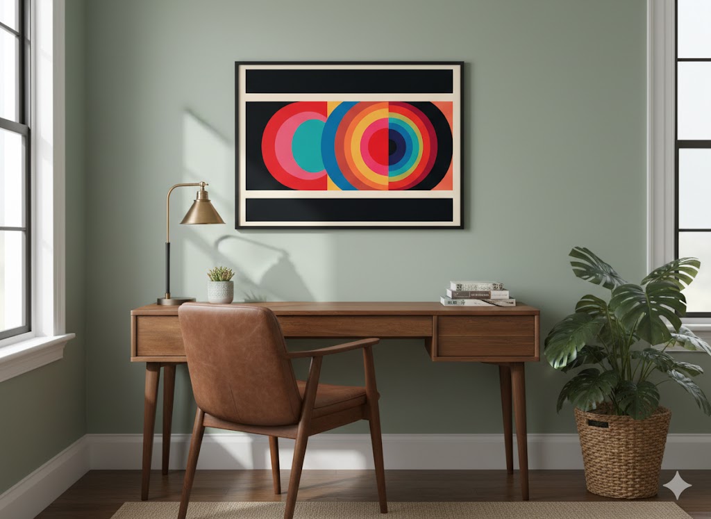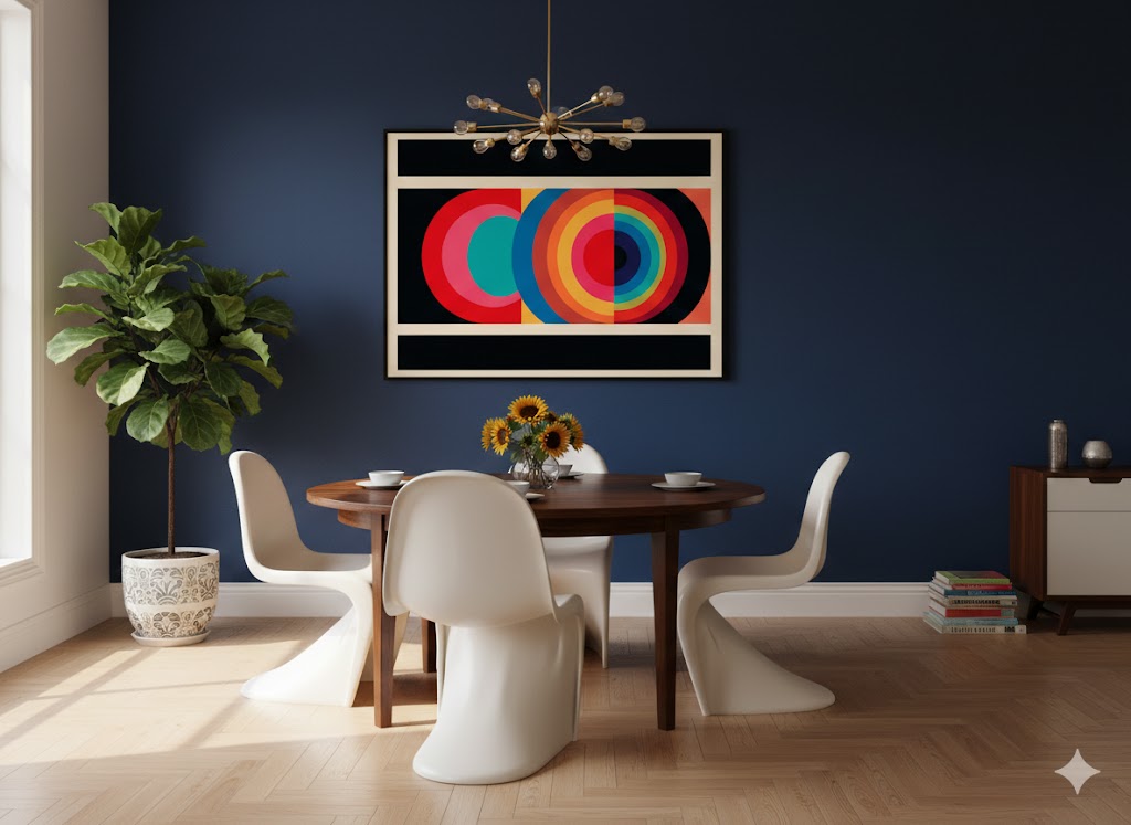 Our latest print isn’t just about shapes—it’s a masterclass in colour theory. By utilizing a “Triadic” colour scheme—red, blue, and yellow—this piece creates a natural harmony that the human eye finds incredibly satisfying. The interlocking circles, reminiscent of both Bauhaus precision and 70s optimism, make it a true statement piece.